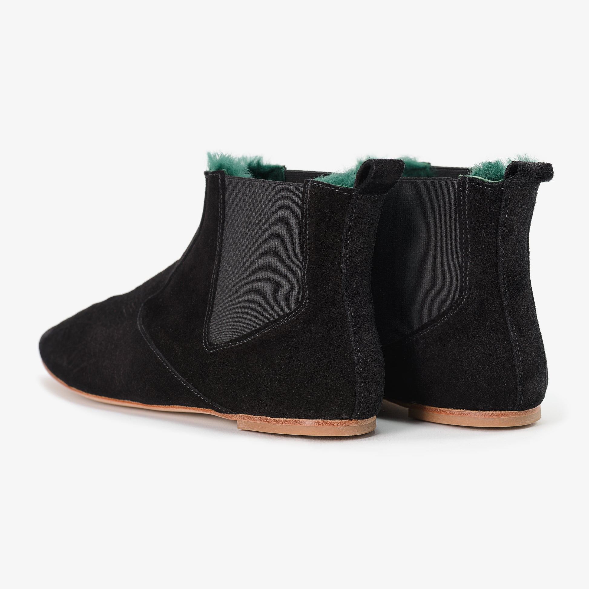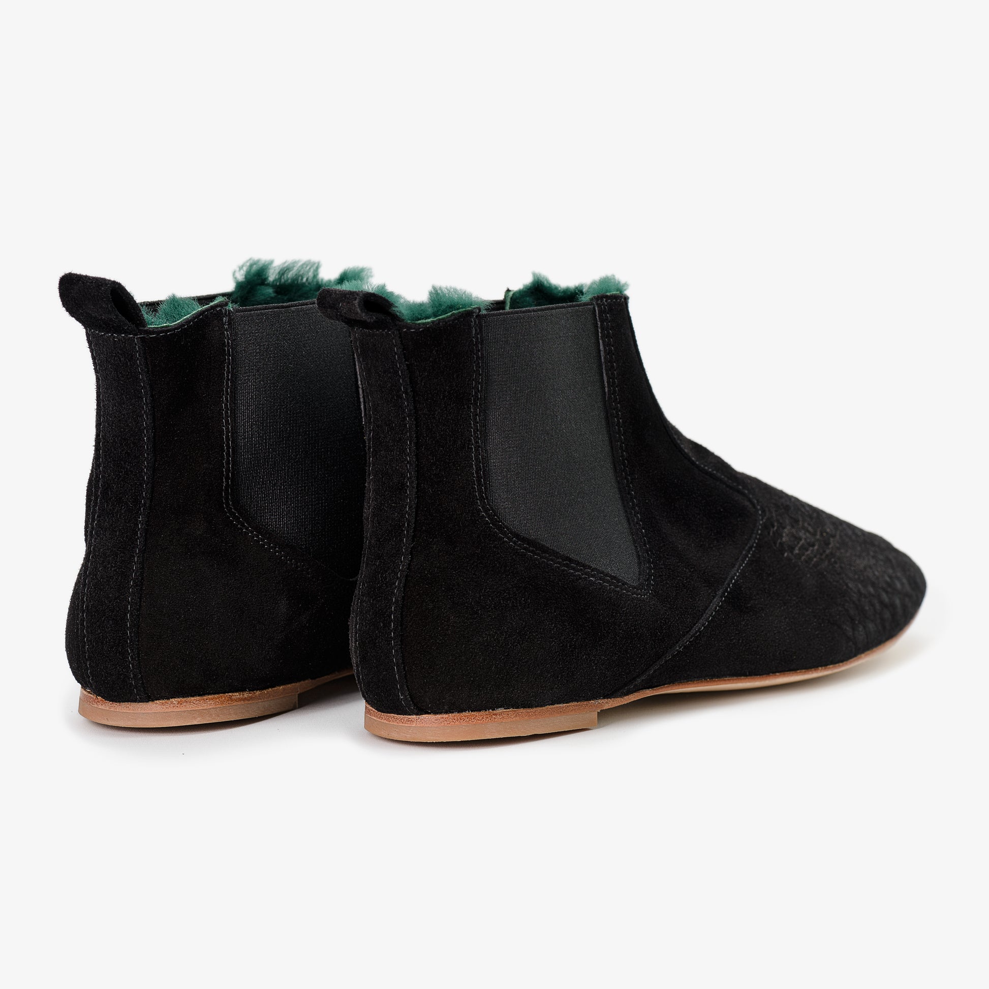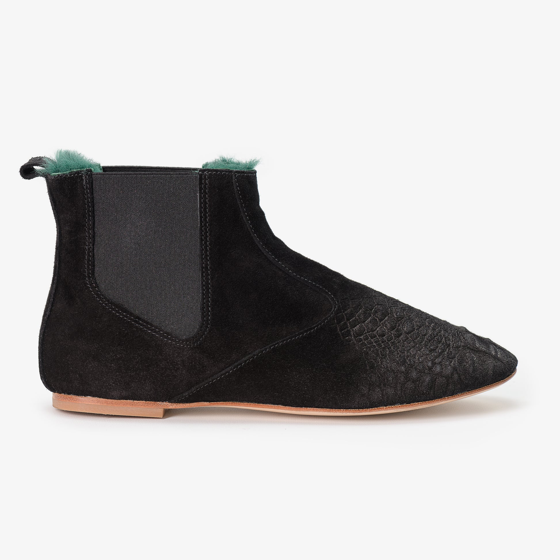 Chelsea boots in black suede leather with crocodile effect embossed toe. Super-soft green shearling fur lining gives exceptional and unique richness to this pair.